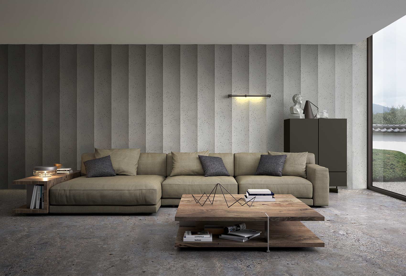 L’azienda brianzola sviluppa attraverso le proprie finiture e la varietà di superfici realizzate sensazioni tattili e visive uniche, ispirate al mondo della natura o a quello industriale.